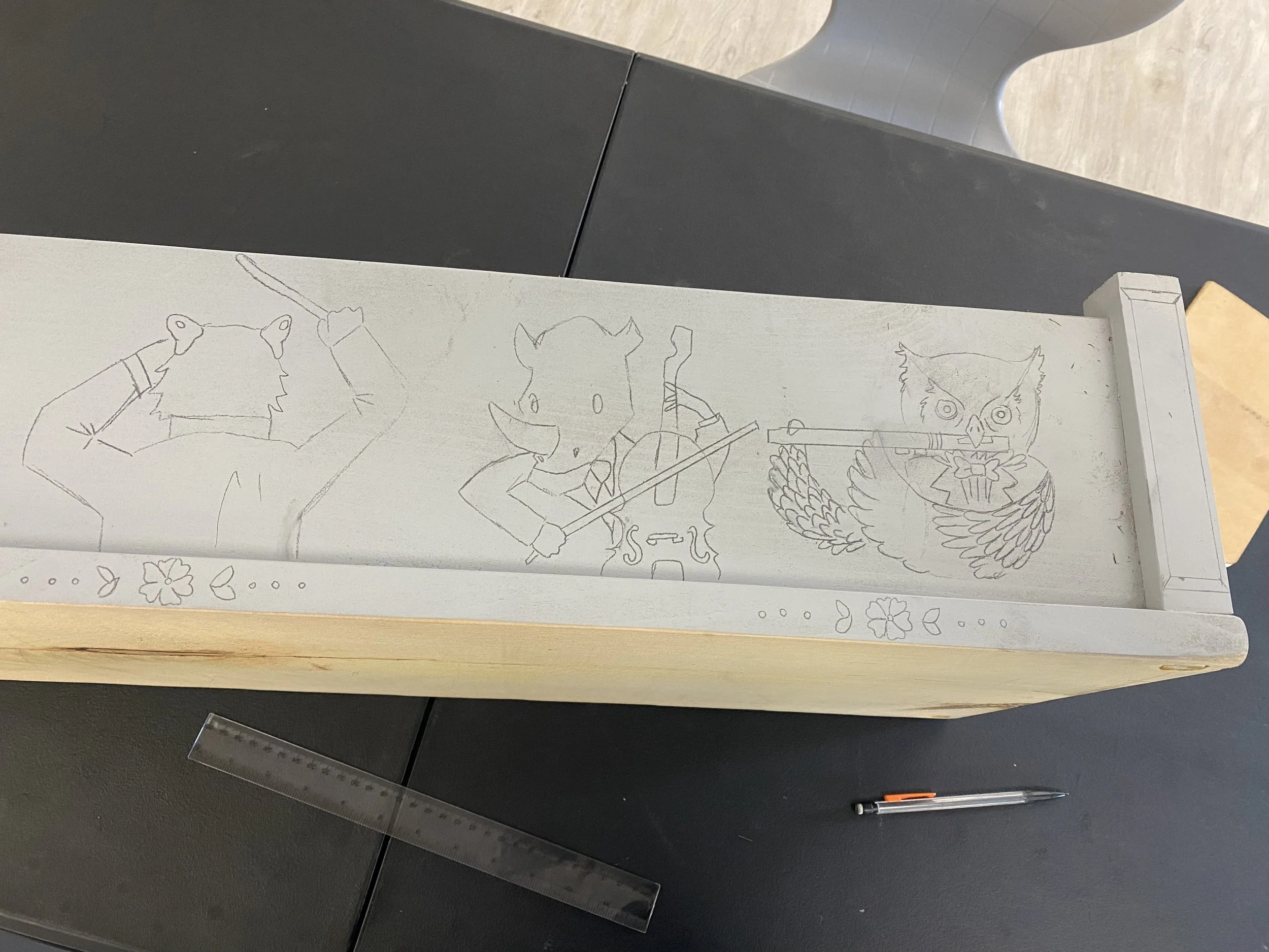 Above are my sketches for the theatre. I measured the bottom area that I would have to paint and recreated the exact measurements on a piece of paper I cut and taped together. Once I was happy with the final design…
